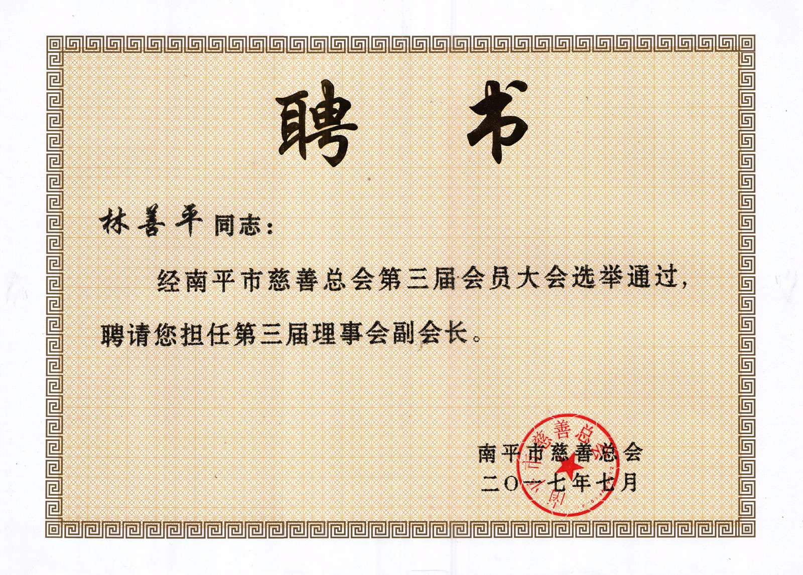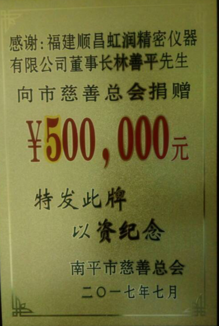 2017年7月28日,南平市慈善捐贈大會暨市慈善總會換屆會議在南平市委舉行,福建順昌虹潤董事長林善平再次當選為南平市慈善總會第三屆理事會副會長,這也是林善平董事長第三次當選此職。同時,在本次慈善捐贈大會上,他再次向市慈善總會捐款50萬元。他表示,他還將一如既往,繼續(xù)加大對社會公益事業(yè)的支持力度,積極投身公益和慈善事業(yè),為南平市的慈善事業(yè)作出更大的貢獻。目前,林善平董事長各項公益捐款累計已達1000余萬元。