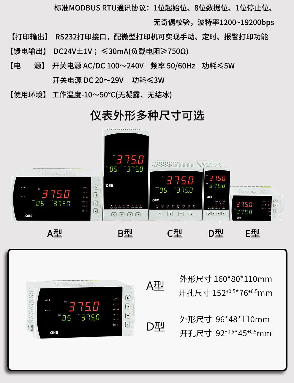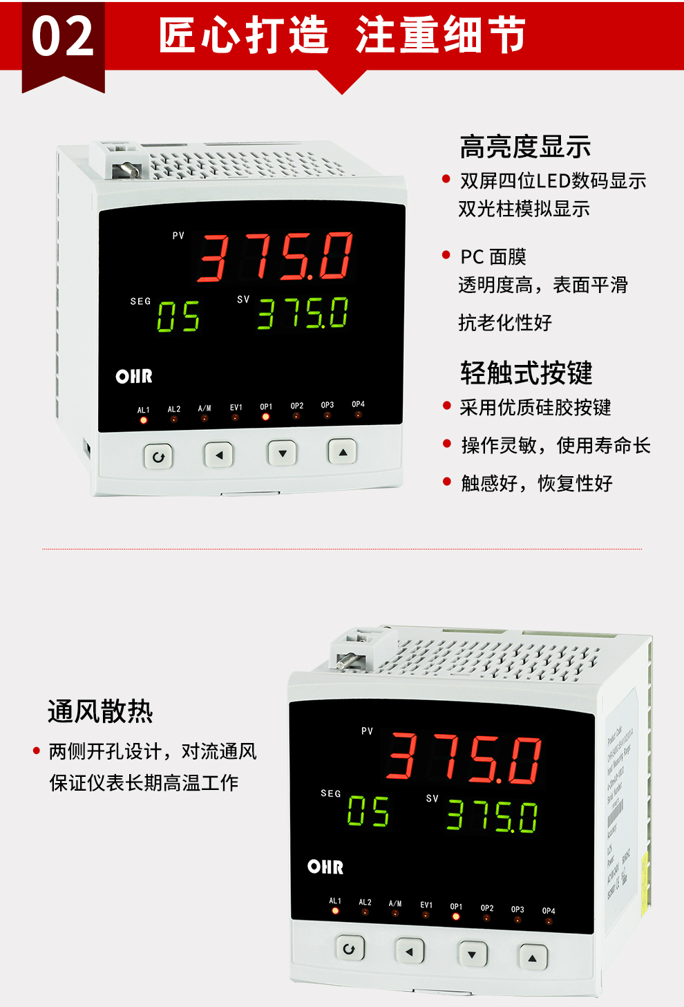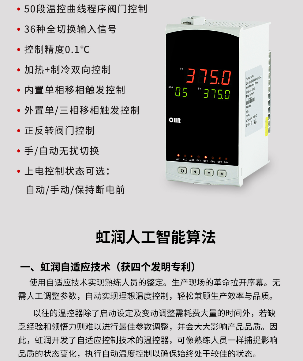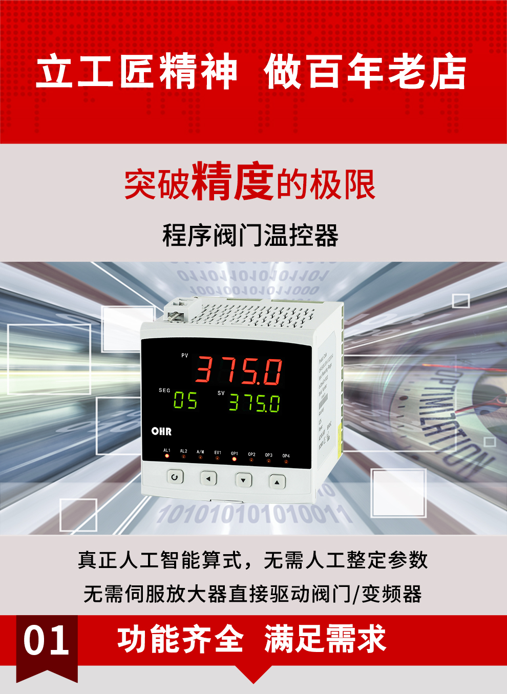 OHR-E401系列程序閥門溫控器/調節儀采用真正的人工智能算式,儀表啟動自整定功能,可以根據被控對象的特性,自動尋找最優參數以達到很好的控制效果,無需人工整定參數??販鼐然具_±0.1℃,無超調、欠調,達國際先進水平。