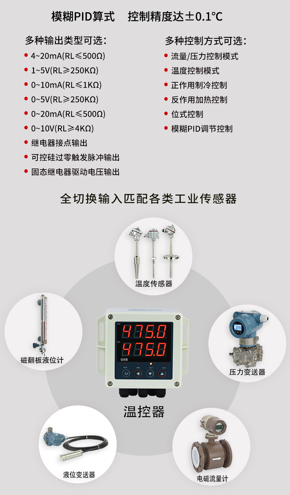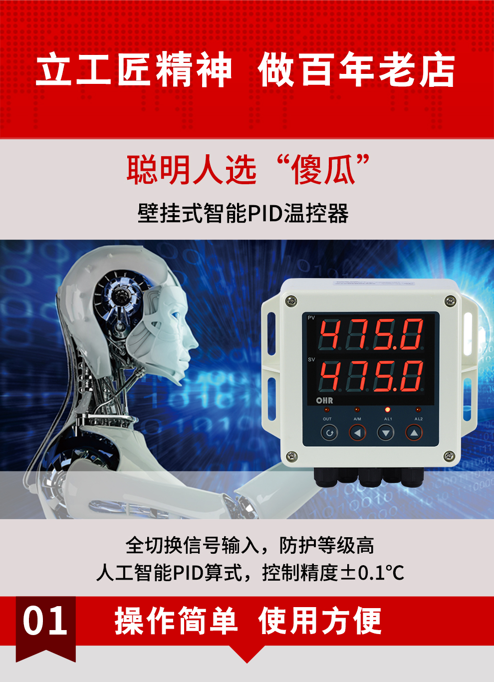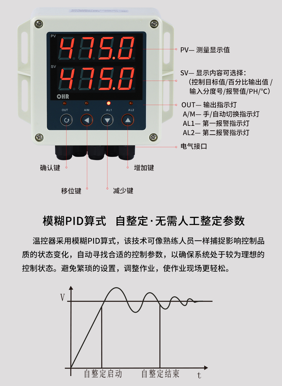 OHR-BG30/BG40系列壁掛式智能溫控器/60段程序溫控器采用了表面貼裝工藝,全自動貼片機(jī)生產(chǎn),具有很強(qiáng)的抗干擾能力。本儀表采用人工智能算式,儀表啟動自整定功能,可以根據(jù)被控對象的特性,自動尋找參數(shù)以達(dá)到很好的控制效果,無需人工整定參數(shù),控溫精度基本達(dá)±0.2℃,無超調(diào)、欠調(diào),性價比高。