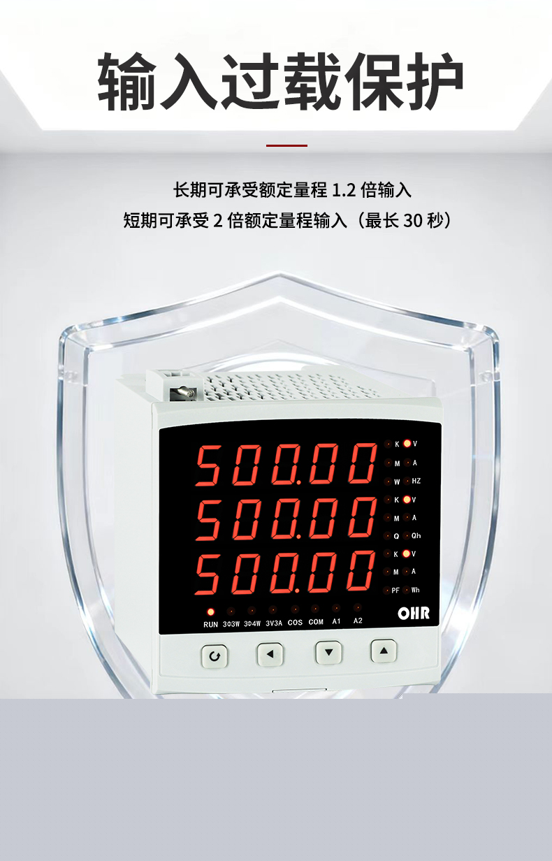 OHR-C300系列三相綜合電量表采用大規模集成電路和高亮度長壽命的LED顯示器,應用數字采樣技術,對三相電氣線路中的相電壓、線電壓、相電流、線電流、有功功率、無功功率、視在功率、頻率、功率因數、等進行實時測量顯示與控制。