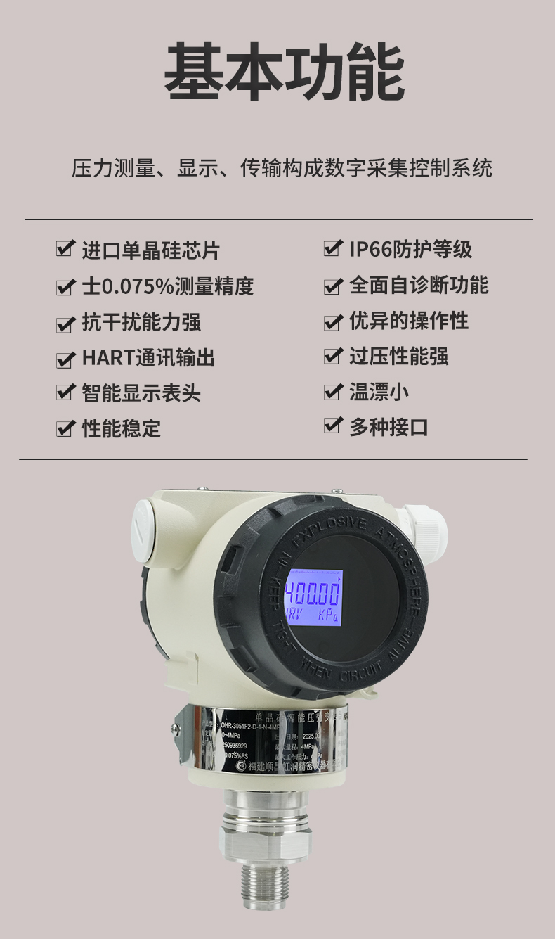OHR-3051F2智能單晶硅直裝壓力變送器能準(zhǔn)確的測量壓力,并把它轉(zhuǎn)換成4~20mADC的輸出信號。該變送器可通過三按鍵本地操作,或通用手操器、組態(tài)軟件、以及手機APP遠程操作,在不影響4~20mA DC的輸出信號的同時,進行顯示與組態(tài)。