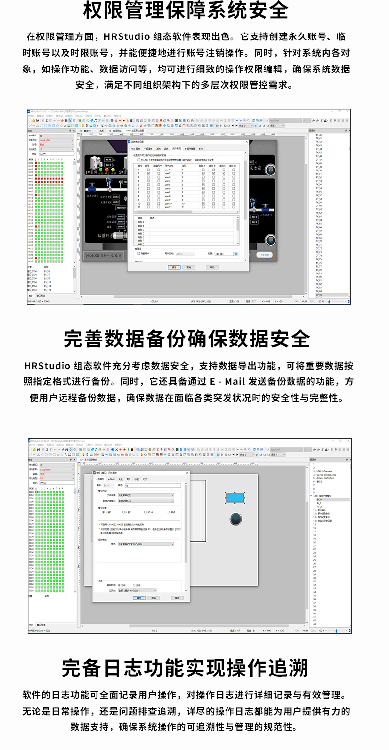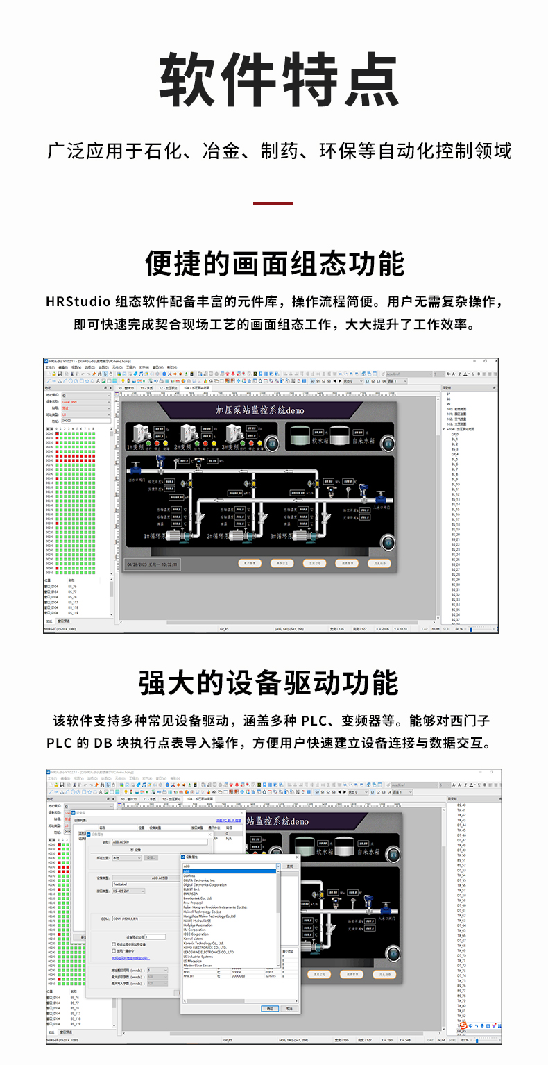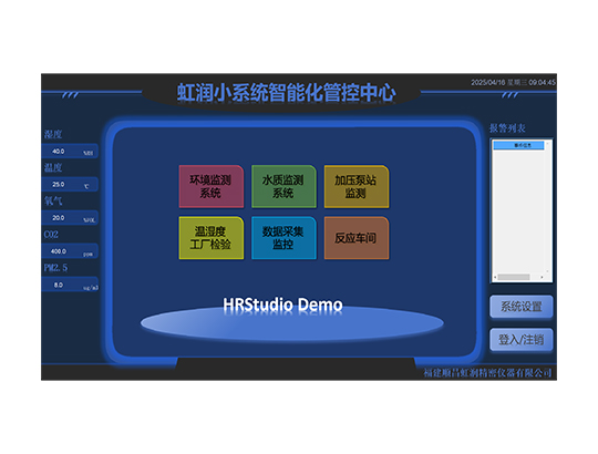 HRStudio 組態軟件是虹潤公司歷經多年潛心研發、擁有完全自主知識產權的核心產品,是一款功能多樣的自動化系統軟件。適用于監控中心平臺的 SCADA 監控系統開發,可在個人 PC 或監控中心大屏上集中監控展示數據。同時,該軟件還能用于虹潤 HMI人機界面、嵌入式采集控制工作站,以及SZ80 水質多參數控制器的二次開發