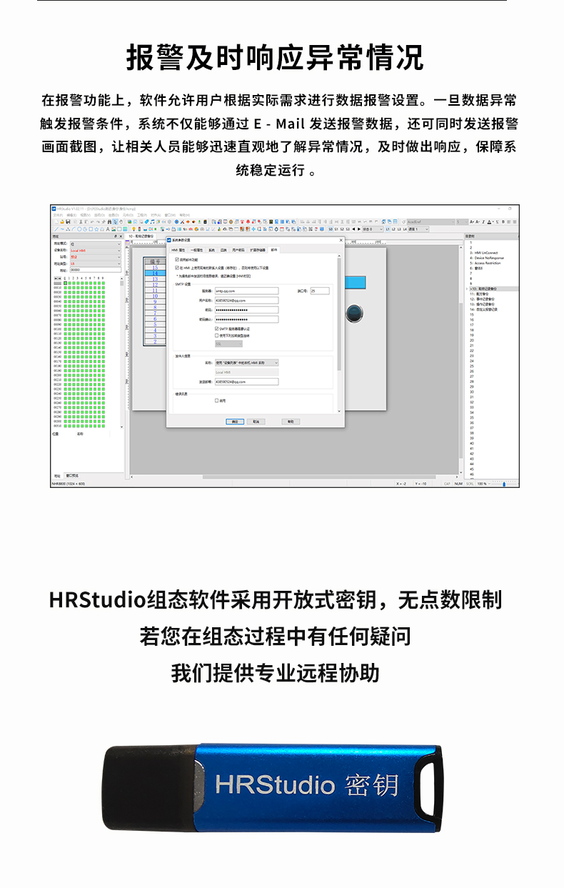 虹潤?HRStudio?組態軟件采用開放式密鑰,無點數限制;凡購買虹潤帶有 RS485/232、以太網通訊功能的儀表,單筆訂單滿 3800 元,即免費贈送HRStudio 組態軟件及對應密鑰;若您在組態過程中有任何疑問,我們提供專業遠程協助。